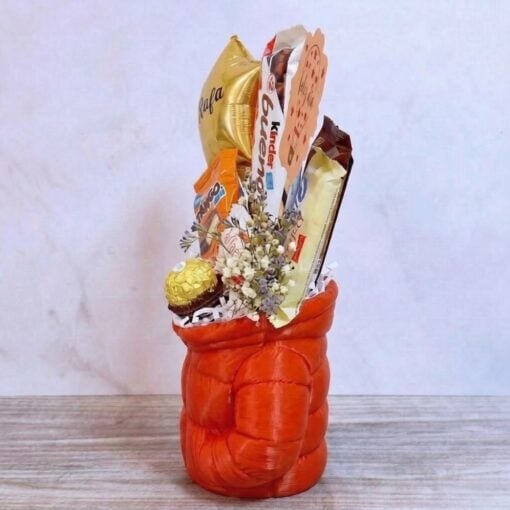 Regalo Good Firiend: Un porta objetos de color mármol con un encantador diseño de corazón viene rellena de bombones variados, un pequeño ramo de flores, el regalo perfecto para expresar un joven amor.