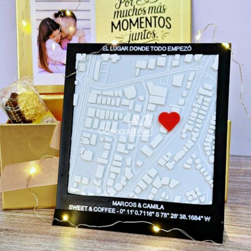 - Mapa en impresión 3d con marco con la ubicación que nos compartas que será el centro del detalle con un corazón que represente un lugar importante y especial (15 x 17 cm)